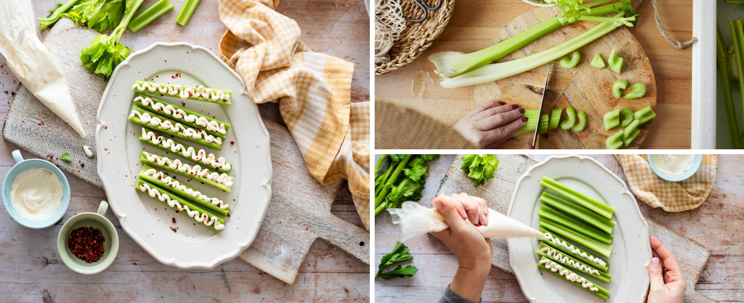 Ontdek een verrassende en smaakvolle traktatie met deze eenvoudige en verfrissende snack - gevulde bleekselderij met een keuze tussen zelfgemaakte yoghurtdip en/of hummus. Perfect voor een feestje, als bijgerecht, of gewoon als een lichte en gezonde snack. De knapperige bleekselderij vormt de perfecte basis voor de romige yoghurtdip met een vleugje pit van chilivlokken, terwijl de hummus een hartige en smaakvolle twist toevoegt. Laat je creativiteit de vrije loop terwijl je deze hapklare lekkernijen bereidt en deel ze met vrienden en familie.
