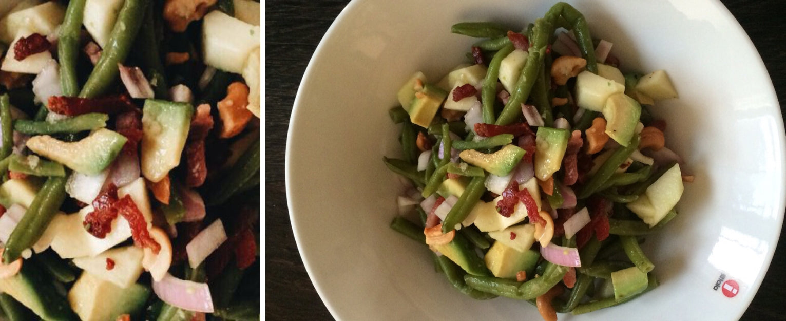Sperziebonensalade met appel, avocado, spekjes en noten
